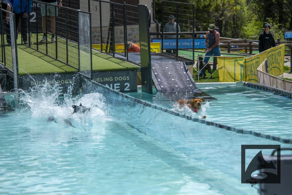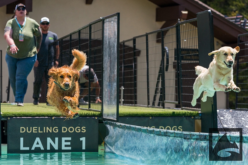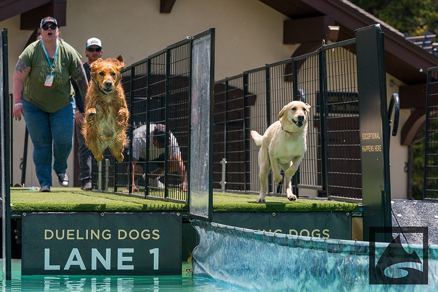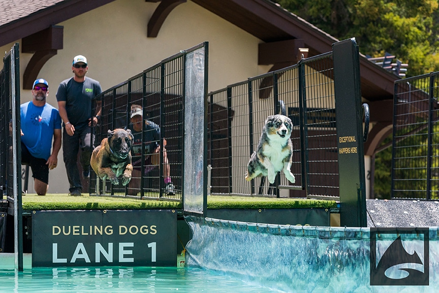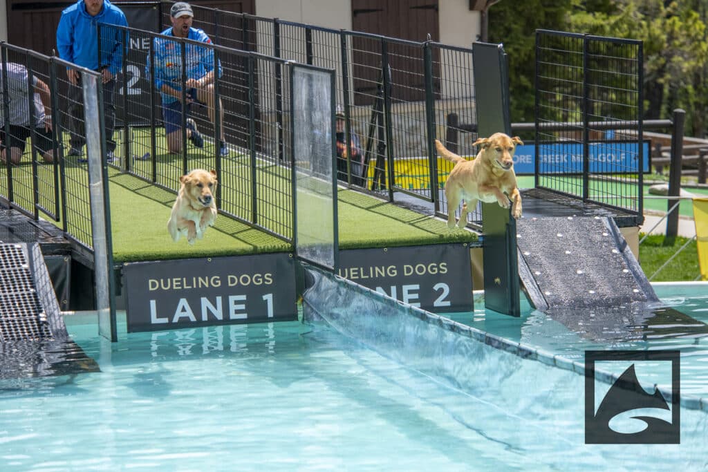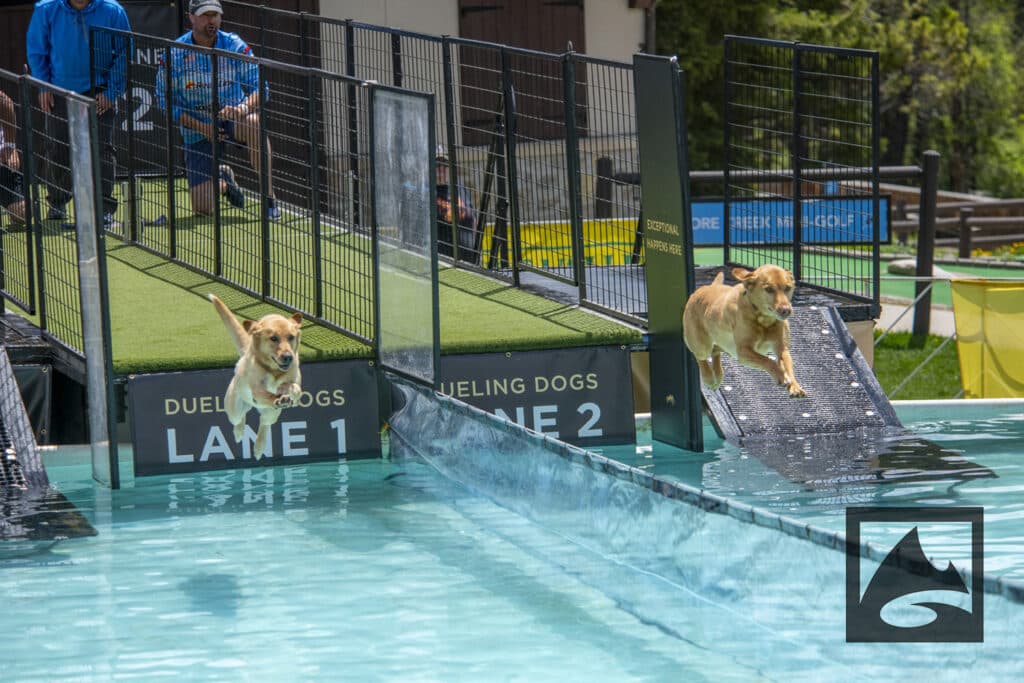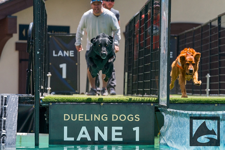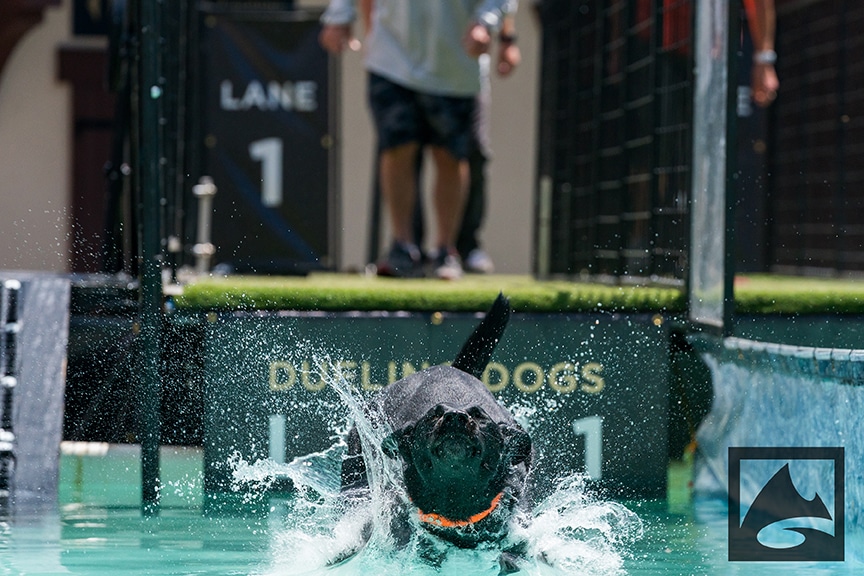 Head-to-head competition — er, should we say, snout to snout. With a pup in each of the two lanes and a toy at the end of the pool, victory is just a leap and a swim away. When the light goes green, the pooches go paddling!