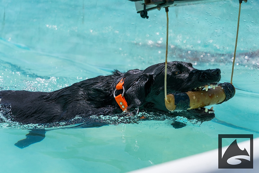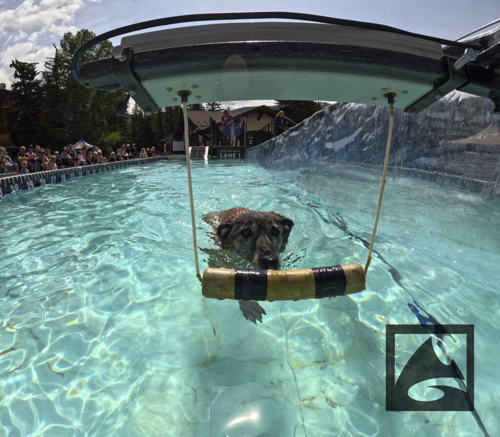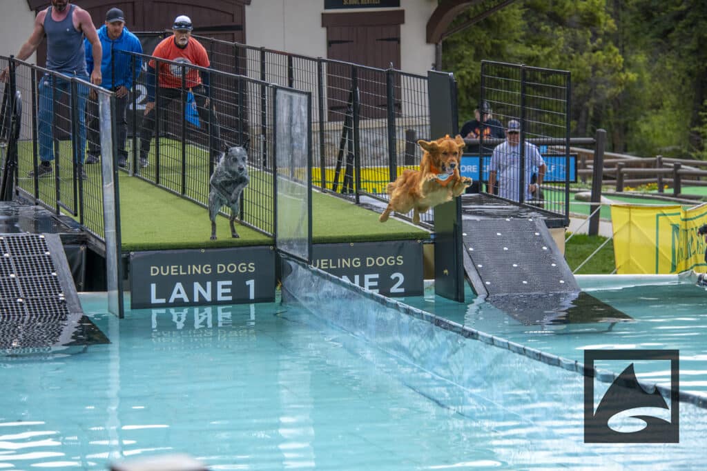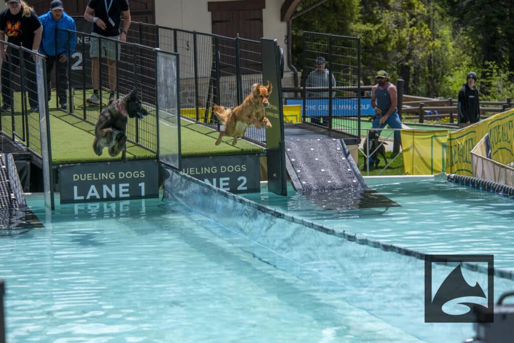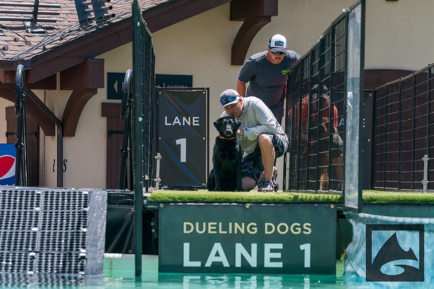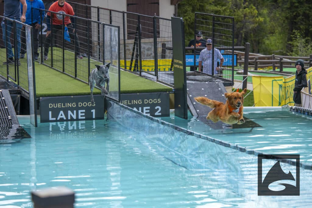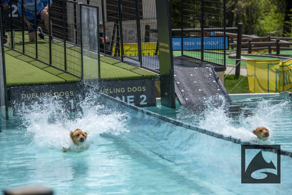 Head-to-head competition — er, should we say, snout to snout. With a pup in each of the two lanes and a toy at the end of the pool, victory is just a leap and a swim away. When the light goes green, the pooches go paddling!